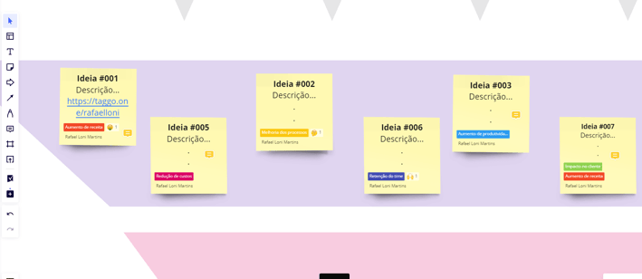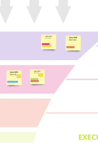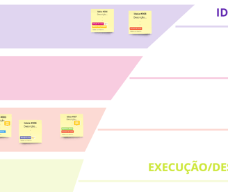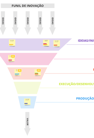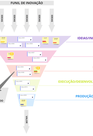 O uso do Miro auxilia ilustrar o conceito do funil, além de servir como um ótimo recurso para uma apresentação mais dinâmica. A imagem a seguir consiste em um exemplo de como organizar um funil de inovação, na qual cada etapa está claramente destacada, e cada uma das ideias está escrita em um post-it. À medida que as ideias forem avançando pelo funil, basta ir arrastando os post-it no quadro.