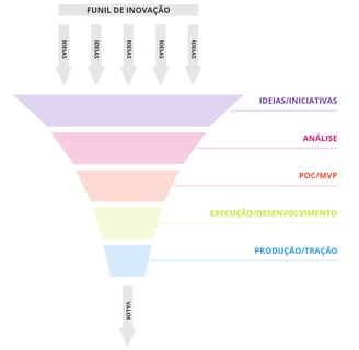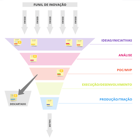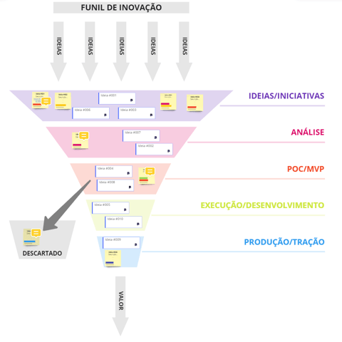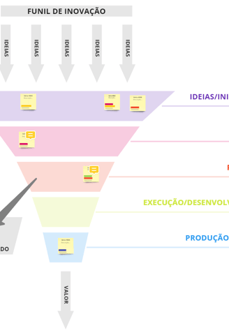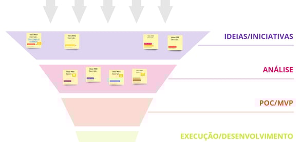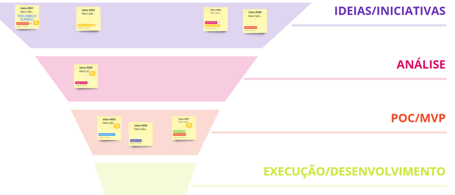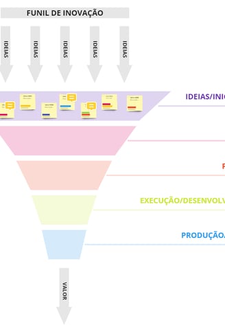 Em resumo, a primeira etapa (abertura do funil) servirá para captar ideias. Ela corresponde a um alto volume de iniciativas e, à medida que as ideias avançam para a etapa seguinte, são priorizadas, sendo que apenas uma parcela delas segue adiante, até a geração de valor e conclusão da iniciativa (saída do funil), volume bem inferior.