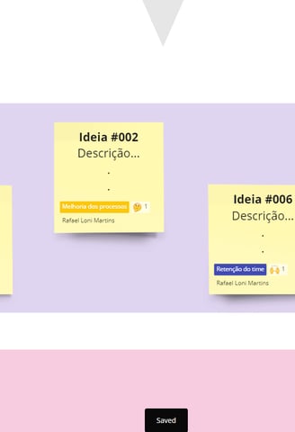 No Miro, essa primeira etapa é simplesmente o registro de cada ideia. Pelo post-it é possível descrever a ideia, adicionar um link ou comentário, criar tags, e incluir outras informações que forem pertinentes para uma boa anotação. Uma dica legal é utilizar as tags para relacionar a ideia aos pilares de inovação. No exemplo acima, cada pilar de inovação é uma tag com uma cor específica, ajudando na classificação e priorização.