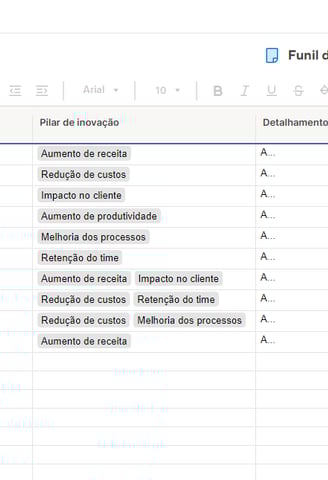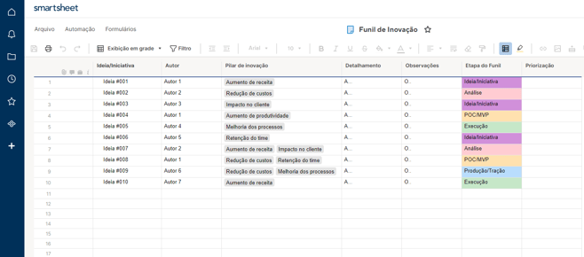 Como exemplo, a imagem a seguir está representando o registro de dez ideias. Note que cada uma está em uma determinada etapa do nosso funil de inovação. Por hora, proponho limitarmos as colunas a apenas informações mais básicas, e em uma segunda parte desse artigo complementaremos com mais informações que vão auxiliar a criação de novos indicadores.