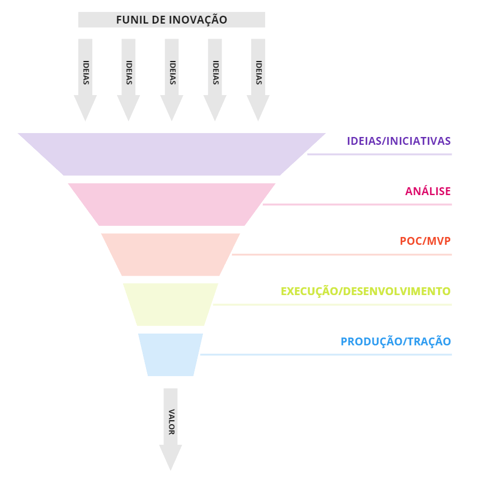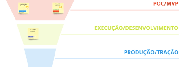 Vale destacar que a quantidade de etapas e o que cada uma delas representa depende de cada contexto. Para facilitar nosso exemplo, segmentei o funil de inovação em cinco fases, que acredito serem relevantes: Ideias/Iniciativas, Análise Inicial, POC/MVP, Execução/Desenvolvimento e Produção/Tração.
