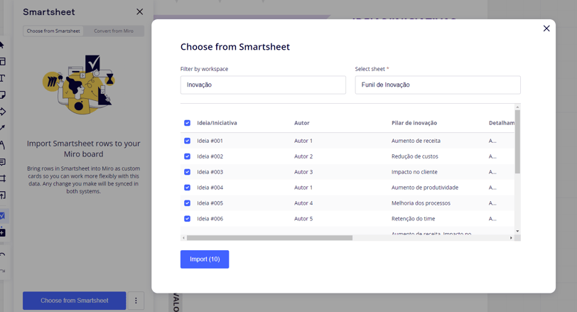No exemplo acima, importei todos os dez registros da nossa planilha do Smartsheet para dentro do nosso quadro do Miro. Note que surgiram novos cards com uma logo do Smartsheet indicando a integração. O trabalho de arrastar os cards pelo funil ainda existirá, porém, não será preciso registrar os dados duas vezes.